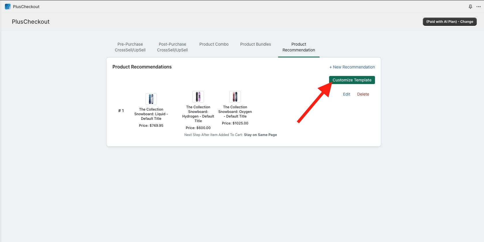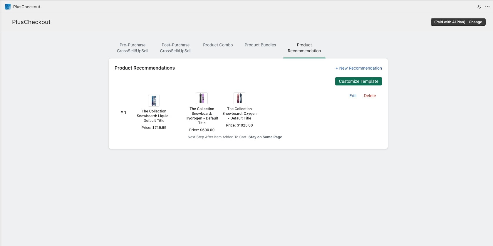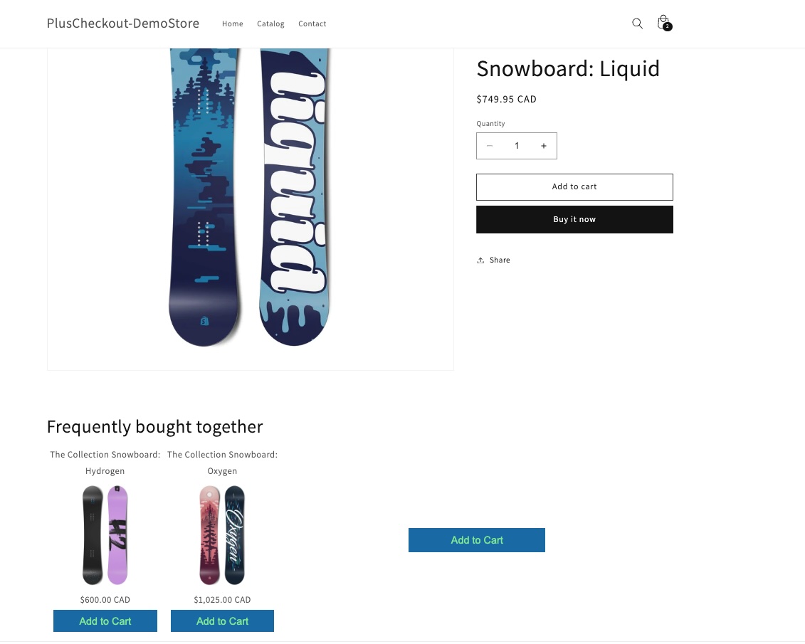 I saved it. Now, let's visit the page on the storefront. As you can see, the product recommendation is working as expected. https://pluscheckout-demostore.myshopify.com/products/the-collection-snowboard-liquid