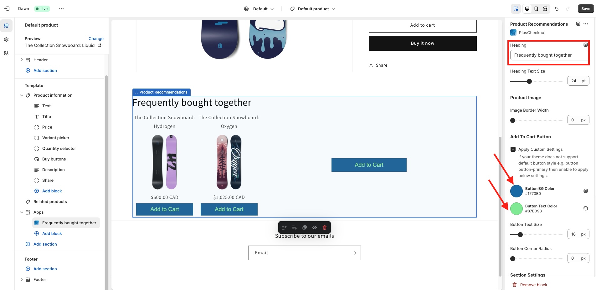 Once you select product recommendation, you will see that you can apply customization as you want. For this example, I changed the recommendation title to 'Frequently bought together' and changed some button text and button background color.